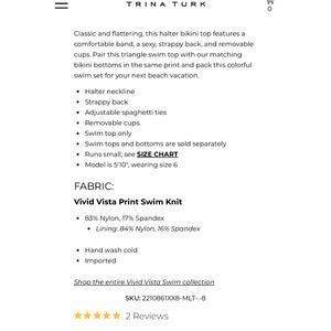 NEW with tags Trina Turk Layered Bikini. This listing is for both the top and bottom. Layered Halter Top with adjustable spaghetti straps. Removable Cups. Moderate Coverage bottoms. Tie sides. Adjustable. Sits at hip.