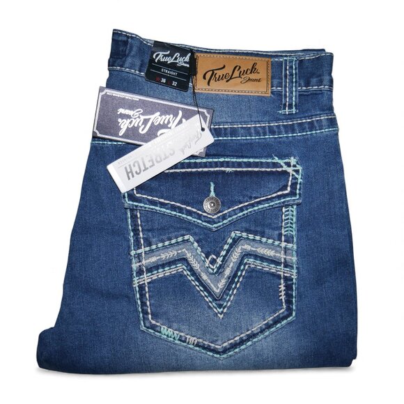 NEW True Luck Straight Leg Jeans Men's Size 36x32 Thick Stitch Embroidered BKE