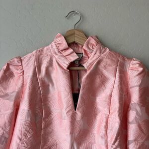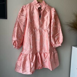 The Tuckernuck Bellini Fil Coupe Palmerston Dress is really all that. A ruffled stand collar and long sleeves create a sophisticated feel while the pastel florals and slightly shimmery texture add a bold pop that makes us want to party all night long. Pink. Size M.