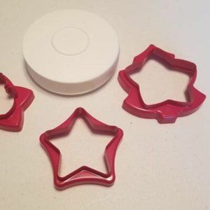 This is a set of Tupperware cookie cutters. It comes with a holder to stack and store all three cookie cutters in a small spot to keep them together.