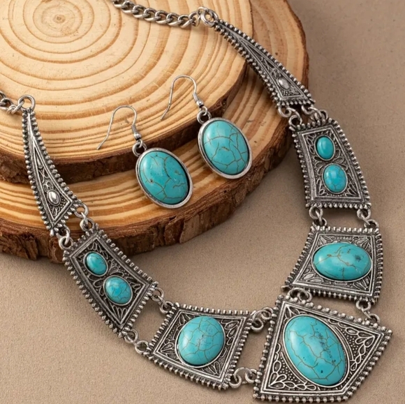 NEW Turquoise Western Silver Statement Necklace and Earring Gift Set Preppy