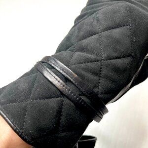 Gorgeous and classy! Black quilted suede on the top with leather palms/underside. Leather fringe ties on the side. Wool/cashmere blend lining. Great for everyday and driving. These make a great gift!