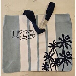 The NEW UGG Canvas Embroidered Palm Tree Bag is a stylish and spacious tote bag perfect for a day at the beach. Featuring a large size with a canvas lining, this bag is both practical and fashionable. The embroidered palm tree design adds a touch of coastal chic to the multicolor exterior, while the double handles make it easy to carry. With white hardware accents and a durable canvas and cotton exterior, this UGG bag is a must-have for any beach-loving fashionista.