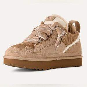Stylish UGG Lowmel sneakers in Sand / tan with unique ribbon laces. Perfect for casual wear. New without box. I ordered the wrong size. My loss is your gain. Just trying to get some of my money back.