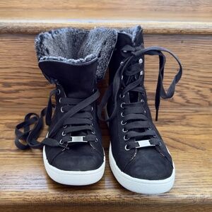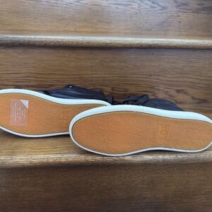 Never worn, New! The UGG Starlyn high-top trainer is available in black leather or suede and features a genuine sheepskin lining for warmth and comfort. UGG emphasizes that their products use premium sheepskin, which is known to conform to the foot over time, so it's often recommended to wear them without socks for the best fit.