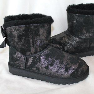 NEW UGG WOMEN'S MINI METALIC SHIMMER BAILEY BOW BLACK SILVER SUEDE BOOTS