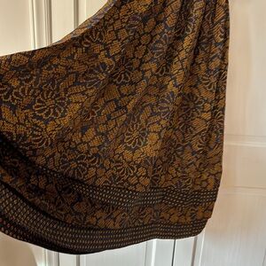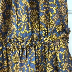 With its playful gold and print, ruffled and gathered detailing, and tie-fastening straps, this dress is the perfect blend of fun and flirtatious. The high-waisted design and round neck make it a flattering choice for any body type, while the sleeveless cut and straight hem keep it effortlessly cool. Whether you're attending a garden party or strolling through the city, the Mika Dress is sure to turn heads and make a statement. The Mika Dress is made from a luxurious blend of viscose and silk - this dress promises to drape your body comfortably. And with its mid-length cut, it's excellent for dressing up or down, swinging on your mood. So whether you're sipping cocktails by the pool or dancing the night away, the Mika Dress from Ulla Johnson will make you feel like a summer goddess. Dry clean it only to keep it looking as new as the day you purchased it.