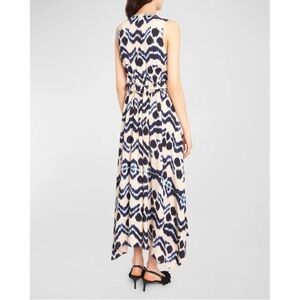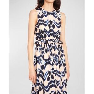 Round neckline, Sleeveless, Ruffle trim at waist, Concealed back zip closure, Asymmetrical hem, Midi length, Lined.