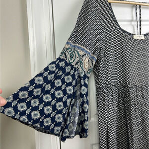 NEW UMGEE Womens Navy Blue Black BOHO BABYDOLL MINI Bell Sleeve Pheasant Dress M