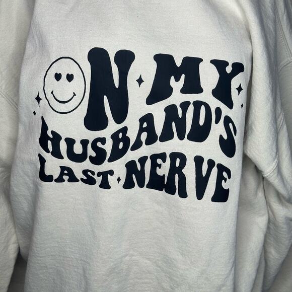 NEW UNBRANDED HYSTERICAL MESSAGE SWEATSHIRT . . . “ON MY HUSBAND’S LAST NERVE”