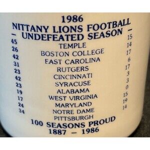 This NEE UNUSED NWOT vintage Penn State mug commemorates the 1986 football season when the Nittany Lions went undefeated. Officially licensed by the university, the multi-color mug features the iconic team logo and is perfect for any fan of this college football team. Made to celebrate 1986 undefeated football seasons this unisex adult-sized mug is a great collectible item for any fan of the Penn State Nittany Lions.