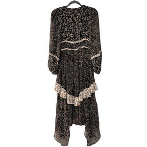 Patchwork print dotted silk-georgette midi dress. Contrast ruffle detailing, sheer balloon sleeves, handkerchief hem, fixed waist, side zipper, lined bodice, and skirt. New without tags.