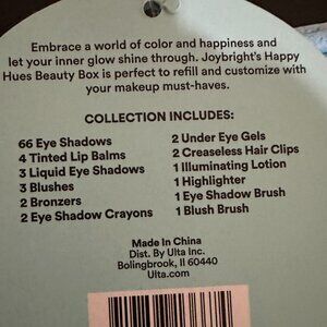*The JoyBright Happy Hues Beauty Box includes 4 Tinted Lip Balms, 66 Eye Shadows, 3 Liquid Eye Shadows, 2 Eye Shadow Crayons, 3 Blushes, 2 Bronzers, 1 Highlighter, 1 Illuminating Lotion, 2 Under Eye Gels