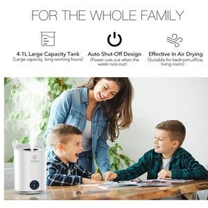4.1L LARGE CAPACITY WATER TANK DESIGN: This humidifier has a 4.1L large capacity water tank and will provide ideal coverage for home, office, baby nursery or any  other large rooms