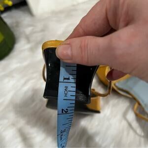New without box Beautiful Unisa Vintage 90s Patent Leather Square Open Toe Slingback Sandals with Low Kitten Block Heels and Small Bows at Toe. Marigold Yellow Shimmer. High Gloss. Women’s Size 6.5. 1.5” Heel.