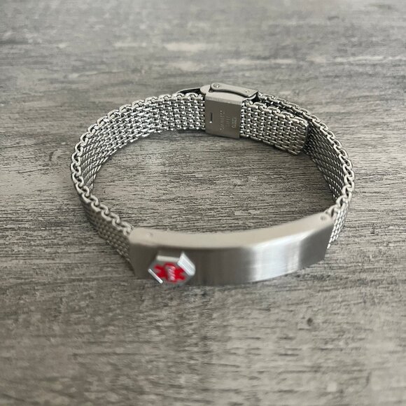 Brand New! Men's (unisex) Mesh Bracelet: 8.5" long. Sliding adjustable buckle. Stainless steel hypoallergenic. Medical wallet card included. The top medical Plate opens up for storage. Includes a waterproof paper you can fill out and store inside!