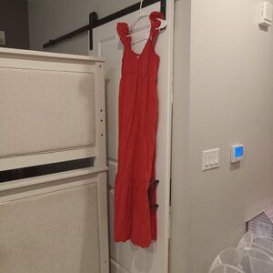 Bright red, very summery dress! Purchased brand new earlier this year for summer! Worn about a dozen times! Great material to keep you cool when hot! Not clingy or tight, nice and loose when hot and need air! Nothing wrong, great dress! Pockets, nice scrunchy shoulder straps with flutter sleeve! Just not going to wear it going forward I don't think! Send me a deal or look at my other stuff and create a bundle and I ship asap the next morning!