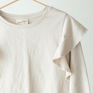 Chic cream blouse with ruffle sleeves. Soft and stylish for any event.