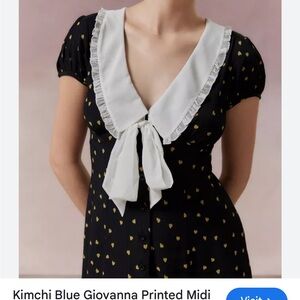 NEW Urban Outfitters Kimchi Blue Giovanna printed midi dress collared Large. New never worn. Pit to pit is 20 in. Waist flat is 16 in. Length is 47 in. 100% rayon. Features small yellow heart print.