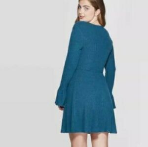 *NEW! V NECK WRAP BELL SLEEVE TEAL SWEATER KNIT DRESS LONG SLEEVE Medium