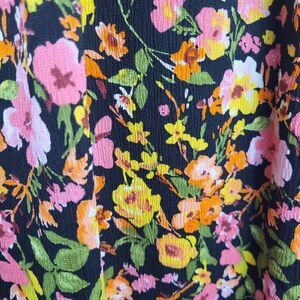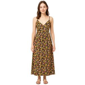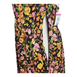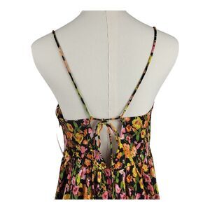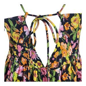 Blooming flowers lend a dose of sweetness to this ankle-grazing maxi boasting a front cutout and tie-back closure. It has a gauze like feel and is wrinkle resistant. Lots of colors, pink, yellow, green, and white on a black background. Two loops in the back to thread the spaghetti straps through before tying it close. A long side zipper on the right helps to pull the dress on and off. Great for that back yard summer party, beach party, vacation, resorts, and anywhere for fun in the sun.