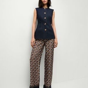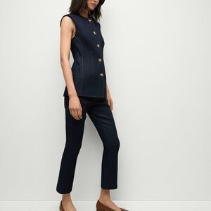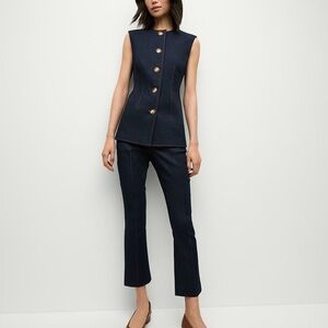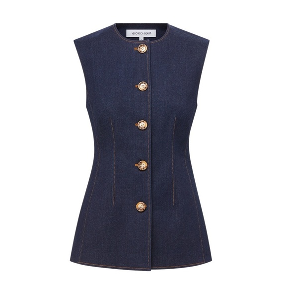 A denim vest, with polish. Expertly tailored from premium stretch cotton, the jewel-neck Jessup is fitted at the waist and falls to a slight flare. Contrast-color topstitching and tortoiseshell buttons complete the look. Pair this tailored denim vest with the Tani pant for a sophisticated take on double denim.