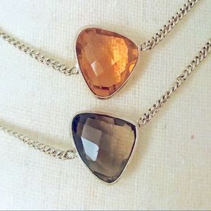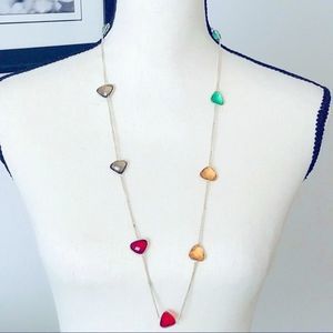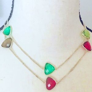New! This unique and colorful long necklace can be worn long or doubled as a choker, as it’s approximately 20” in length. It features gorgeous sparkling resin glass in a variety of colors and shapes. Morganite, peridot green, darker green, ruby red, and smoky quartz add so much charm! Set within a 925 silver encasing this piece will be a signature for years to come!