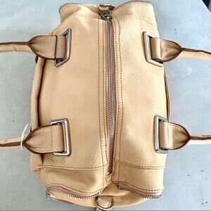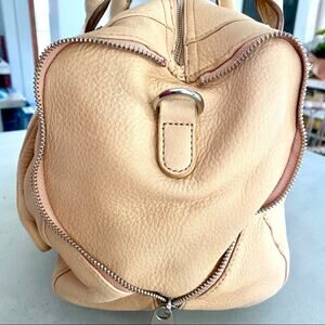 Size is 13”x9”x7” Large nude leather satchel with silver hardware zipper detail. Features front exterior zipper pocket, large snap exterior pocket on back, two interior slip pockets and one interior zip pocket. Comes with crossbody strap. Has two small pen marks on back, dust residue on bottom and discoloration on handle. All pictured. Priced accordingly. Retail is $298.