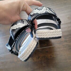 Strappy espadrille sandal with easy grip-tape strap and luxuriously textured snakeskin print.