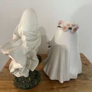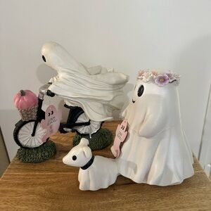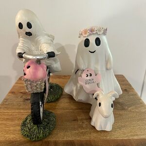 The product is a figurine from the brand Goblin & Ghoul, featuring a ghost walking a dog and a ghost riding a bike with a pumpkin. These whimsical figurines are perfect for adding a spooky touch to your holiday and seasonal decor. Made by the popular brand Goblin & Ghoul, these figurines are sure to delight and entertain your guests during Halloween or any other festive occasion.