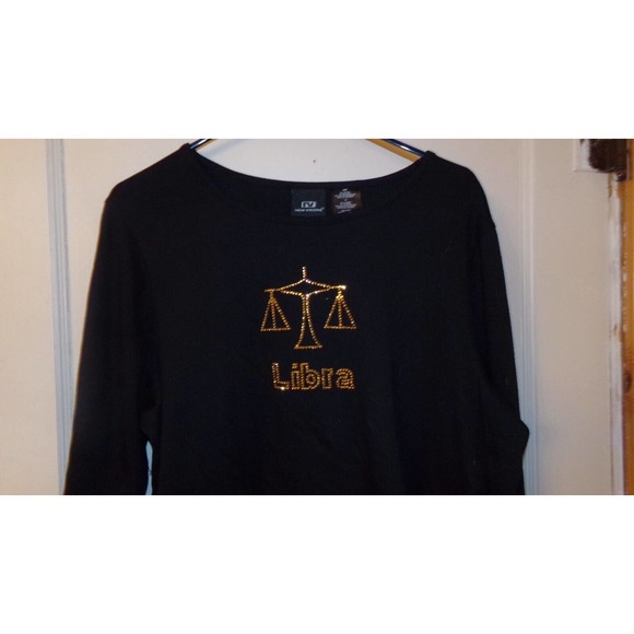 NEW VISIONS LADIES SHIRT BLACK GOLD BEADED LIBRA SCALES DESIGN SZ 16W NWOT. LONG SLEEVES 21 INCHS, 24 INCHES LONG TOP. NICE!