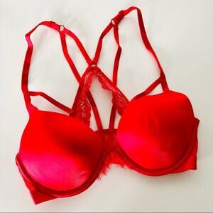 NEW VS VICTORIAS SECRET Pink Red Ruffle Lace Strappy Open Back Underwire Bra 32C