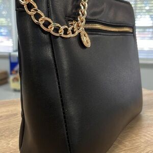 Sleek black quilted design. Gold chain strap adds elegance. Perfect for versatile styling.