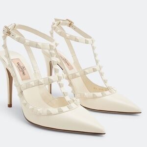STUNNING Authentic Valentino Rockstud Off White Caged pointed toe pumps high heels T100 in light ivory.