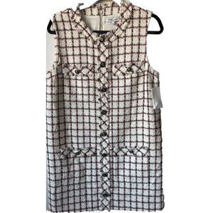 Detail: White, black & red colorSleevelessRound neckCheck patternFaux button placket4 front pocketsBack zipperLinedMini lengthShift fitMSRP $598