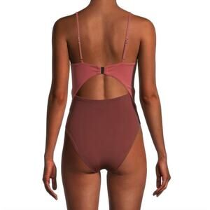 A cutout detail shapes the waist of this two-tone knotted one-piece.