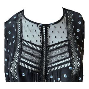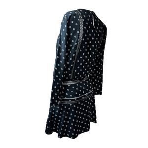 NEW WITHOUT TAGS Veronica Beard Jasmine mini semi sheer lace trimmed dress in breezy print black silk. Relaxed silhouette with gently flared skirt. Made of 100% crepe silk with long sleeves, button keyhole back and fully lined. Right Side zip with 3 snap buttons above for extra closure.