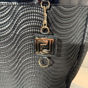This designer bag is a must-have for any fashion-forward woman and is part of the Versace Parfums product line. patent black leather style.