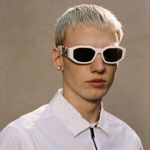 Versace VE4361 401/87 are a statement piece for the fashion-forward individual. These sunglasses feature a striking white frame, beautifully contrasted by dark grey lenses, creating a bold and chic look. The frame boasts a modern, rectangle shape that adds a touch of geometric elegance. Constructed from premium nylon, they offer a perfect blend of durability and comfort.