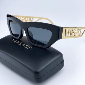 NEW Versace VE4432U 90s Vintage Logo GB1/87 Black Gold Frame Logo Dark Grey Cat Eye Women Sunglasses
