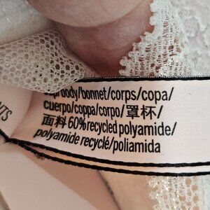 NEW!! New with tags. This elegant Victoria's Secret corset top features a delicate lace overlay in a soft blush pink shade. Designed with adjustable straps and a structured bodice, it provides a flattering fit and stylish support. Crafted from 60% recycled polyamide, this piece is both luxurious and environmentally conscious.