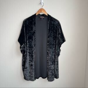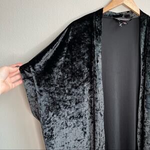 Victoria's Secret Luxe Kimono Robe Black Crushed Velvet. Features a short mini length, wide sleeves, embroidered heart Angel graphic at back center neckk, open kimono style, allover super soft crushed velvet velour fabric in sleek black color. New without tags. Viscose Polyamide.