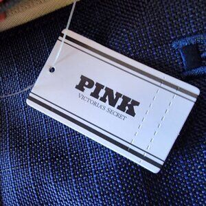MSRP: $59.95 - Large canvas tote bag / weekender bag - shade of navy blue with hints of peach, green & yellow. PINK spelled out embroidered stitched on the front in navy blue. One main zipper compartment & has one front zipper pocket. Inner navy blue satin lining with inner pockets including 1 zipper pocket. 100% Polyester. Made in Philippines.