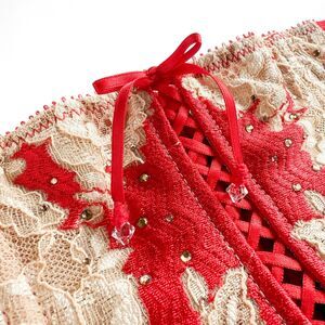 NWT Victoria's Secret Very Sexy Seduction waist cincher corset with removable garter straps. New with tags, from 2012. (Waist cincher ONLY, no panties included.) Bright cherry red with gorgeous details. Cream/beige lace with gold colored rhinestone crystals scattered all over. Little bow with gems at the tails. Inlaid with supportive boning. Side zip/eyelet closure. Ribbon ties to adjust size. Red mesh is very soft and stretchy.