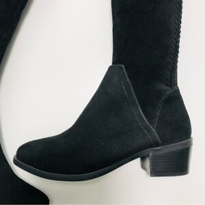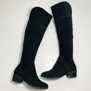 Vince Camuto Bernadine Black Suede Over The Knee Boots Black suede over the knee boots with a block heel. Perfect for all your fall and winter outfits. Inner leg zipper. Stretch panel in the back. Material: Suede/leather.