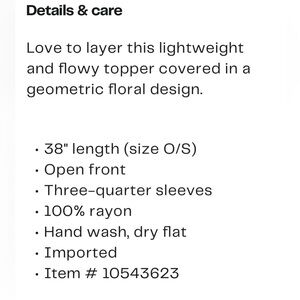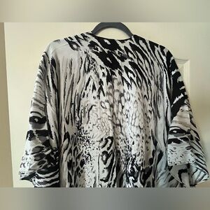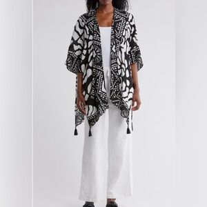 NWT! Stylish black and white women's open sleeve with a bold pattern. Perfect for adding a chic touch to any outfit. Split hem on both sides with tassels. Beautiful! Stylish, comfortable, business casual. Kimono style wrap. Measurements in photos. Smoke free home. OSFM