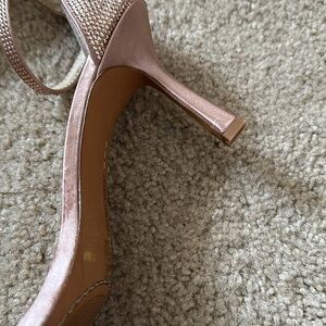 Sparkling embellishments add a touch of glamour to a leather ankle-strap sandal set on a tapered heel for a sophisticated finish to an evening look.