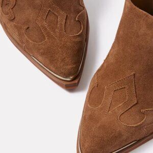 Designed with traditional Western styling, the Greta mules by Vince Camuto are crafted in soft brown suede and feature an angled stacked heel and pointed toe with a metal hardware detail.