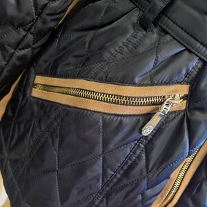 Chic quilted design with stylish faux suede trim. Features a belted waist and gold-tone logo buttons and zippers, faux suede elbow accents. Two zippered pockets in front, button cuffs. 100% polyester. T
