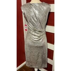 This gorgeous Vince Camuto size 8 dress features a metallic silver knit fabric with a cowl neck and a sleeveless sheath style. The knee-length dress has a zip closure and is designed for a cocktail party or night-on-the-town occasion. Made of polyester/spandex blend, it is recommended for hand wash only. The dress is a size 8 and showcases a modern metallic theme.